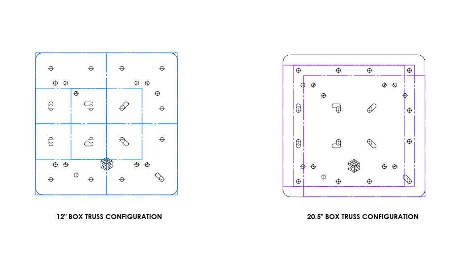 The EZ HUG 2×2 bolts to a 12” x 12” box truss and a 20.5” x 20.5” truss as indicated by the blue overlay for the 12” and the purple overlay for the 20.5”.